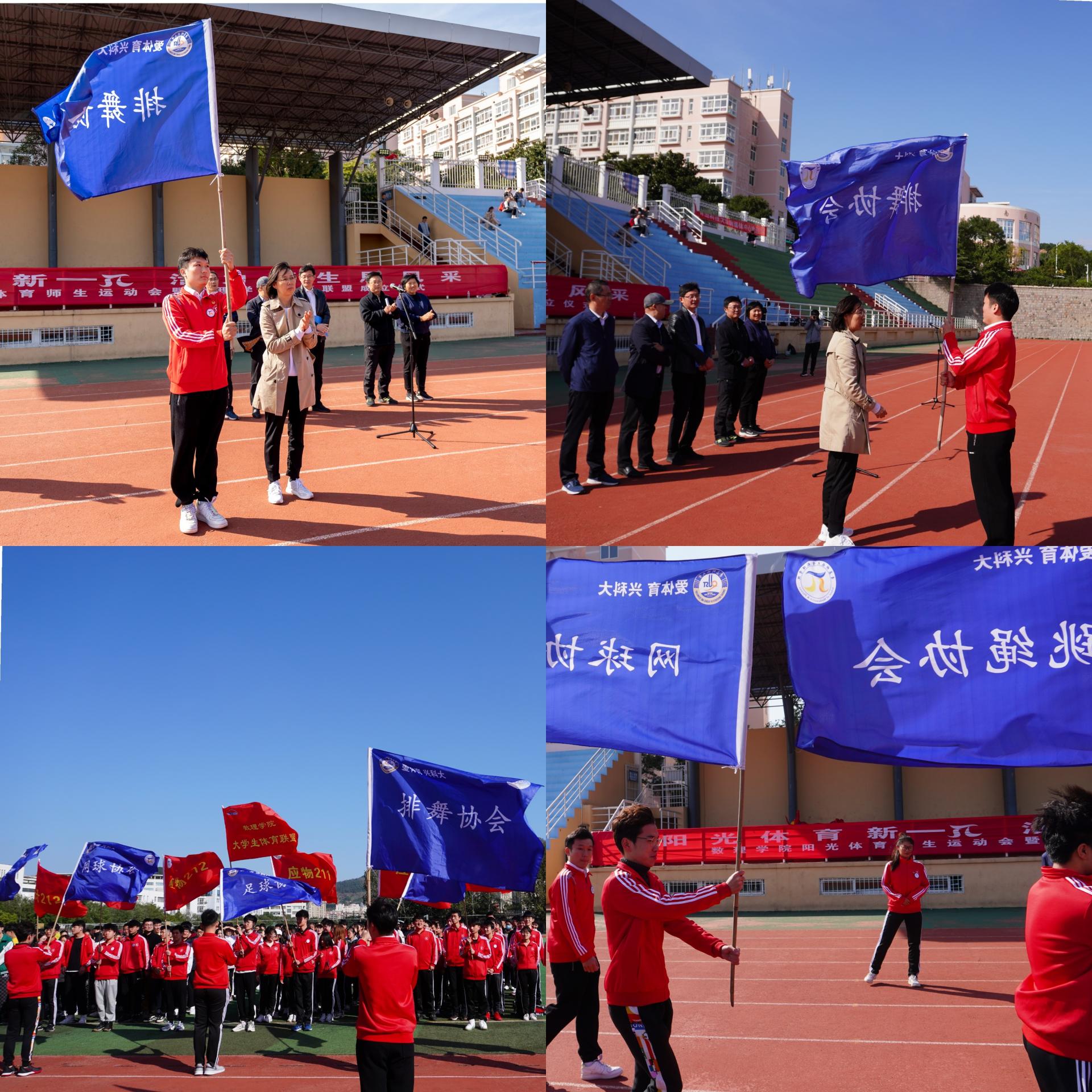 学院党委书记李淑贞为学院体育联盟下设的六个协会授旗,会旗迎风招展,让人心潮澎湃!